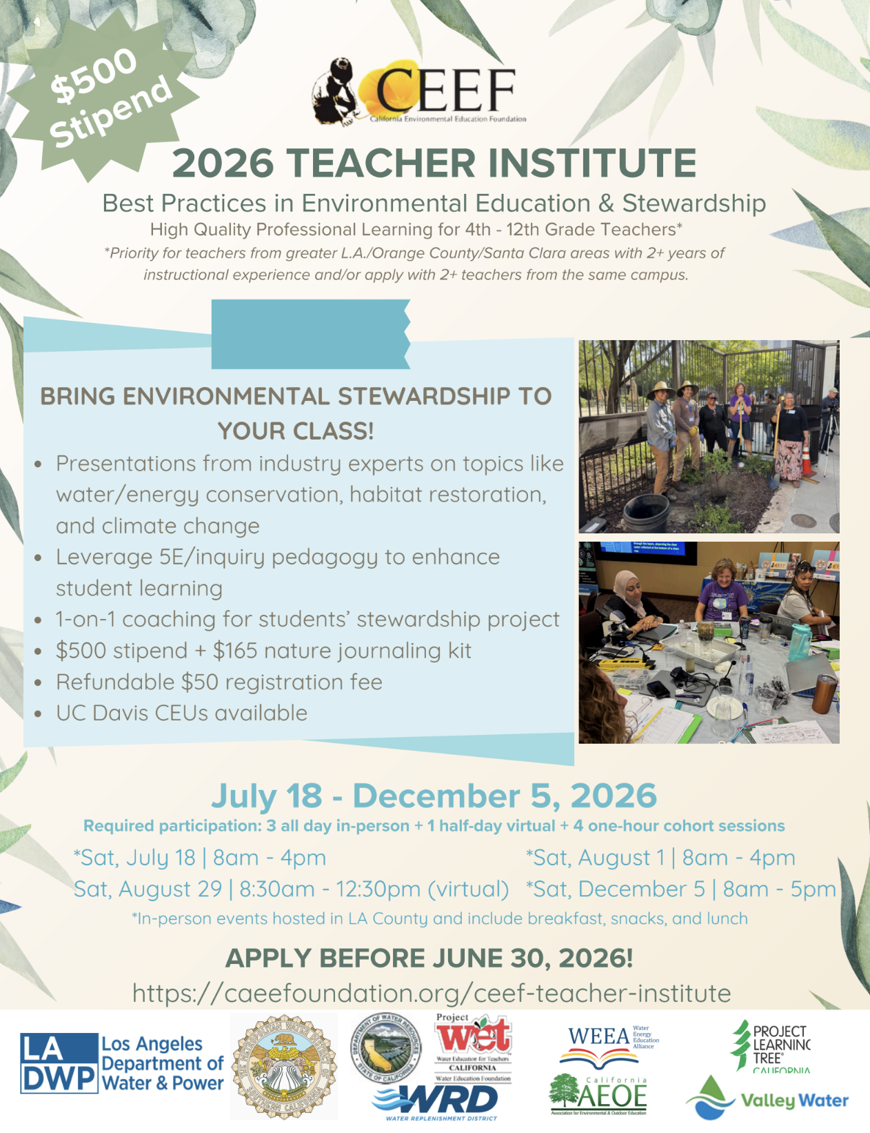 The California Environmental Education Foundation (CEEF) invites educators who teach students in grades 4-12 at schools in Los Angeles and Orange Counties to join the 2025 CEEF Teacher Institute, “Best Practices of Environmental Education and Stewardship.” Priority registration is given to teachers from the greater LA/Orange County areas with 2+ years of instructional experience and/or in teams of 2 or more teachers from the same campus.